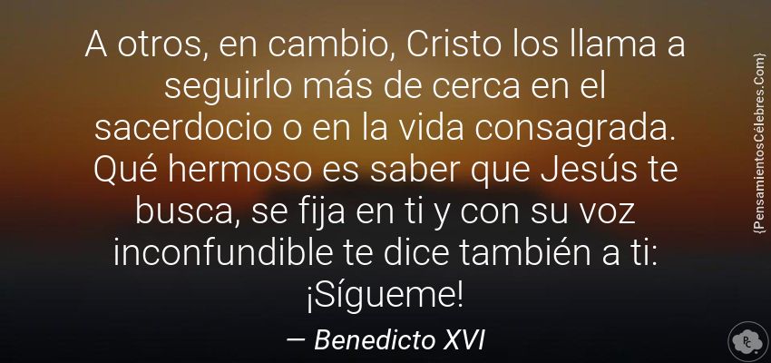 "A otros, en cambio, Cristo los llama a seguirlo más de cerca en el sacerdocio o en la vida consagrada. Qué hermoso es saber que Jesús te busca, se fija en ti y con su voz inconfundible te dice también a ti: ¡Sígueme!"