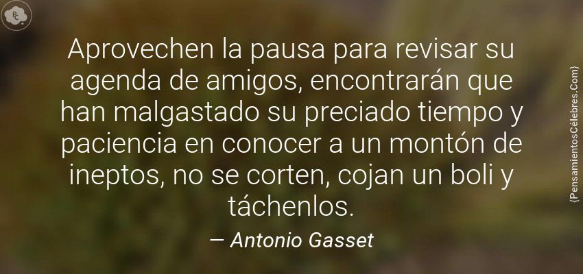 "Aprovechen la pausa para revisar su agenda de amigos, encontrarán que han malgastado su preciado tiempo y paciencia en conocer a un montón de ineptos, no se corten, cojan un boli y táchenlos."