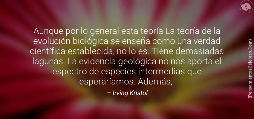 "Aunque por lo general esta teoría La teoría de la evolución biológica se enseña como una verdad científica establecida, no lo es. Tiene demasiadas lagunas. La evidencia geológica no nos aporta el espectro de especies intermedias que esperaríamos. Además, "
