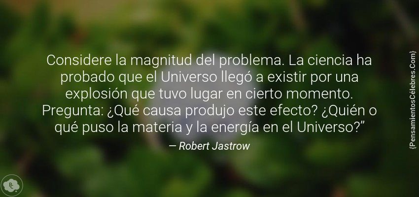 "Considere la magnitud del problema. La ciencia ha probado que el Universo llegó a existir por una explosión que tuvo lugar en cierto momento. Pregunta: ¿Qué causa produjo este efecto? ¿Quién o qué puso la materia y la energía en el Universo?”"