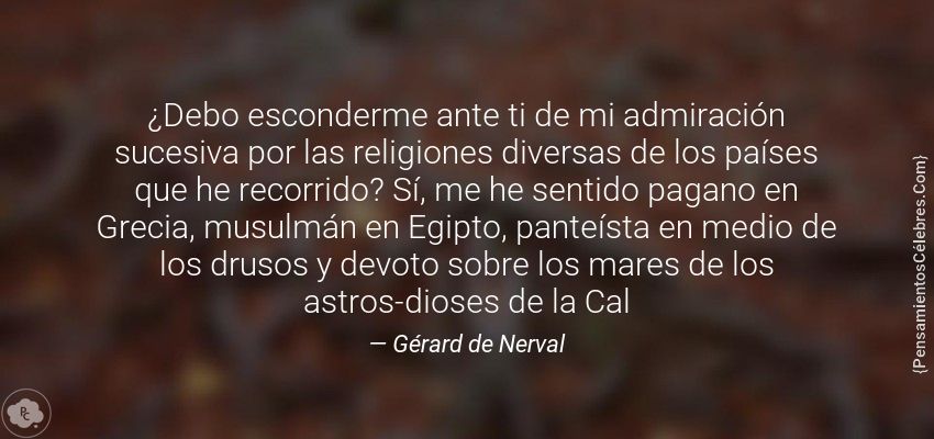 "¿Debo esconderme ante ti de mi admiración sucesiva por las religiones diversas de los países que he recorrido? Sí, me he sentido pagano en Grecia, musulmán en Egipto, panteísta en medio de los drusos y devoto sobre los mares de los astros-dioses de la Cal"