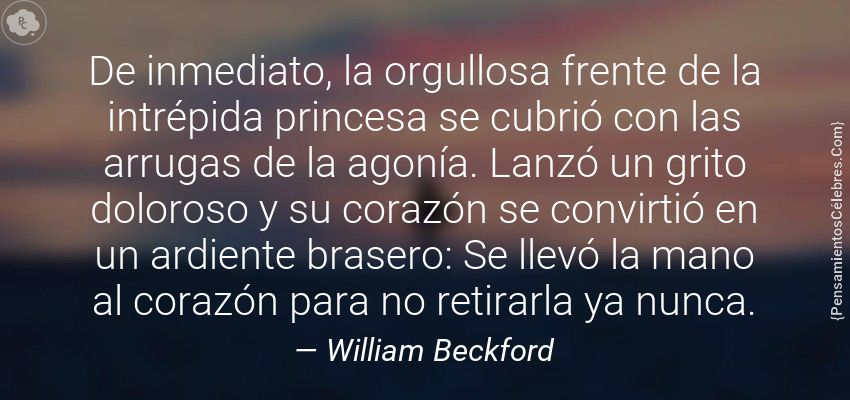 "De inmediato, la orgullosa frente de la intrépida princesa se cubrió con las arrugas de la agonía. Lanzó un grito doloroso y su corazón se convirtió en un ardiente brasero: Se llevó la mano al corazón para no retirarla ya nunca."
