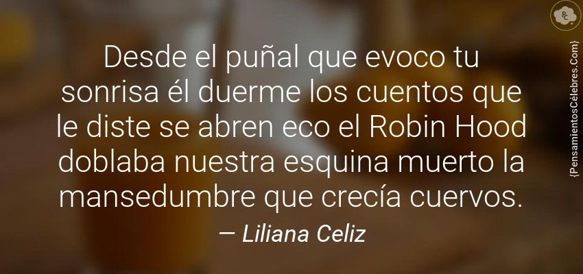 "Desde el puñal que evoco tu sonrisa él duerme los cuentos que le diste se abren eco el Robin Hood doblaba nuestra esquina muerto la mansedumbre que crecía cuervos."