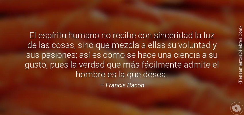 "El espíritu humano no recibe con sinceridad la luz de las cosas, sino que mezcla a ellas su voluntad y sus pasiones; así es como se hace una ciencia a su gusto, pues la verdad que más fácilmente admite el hombre es la que desea."