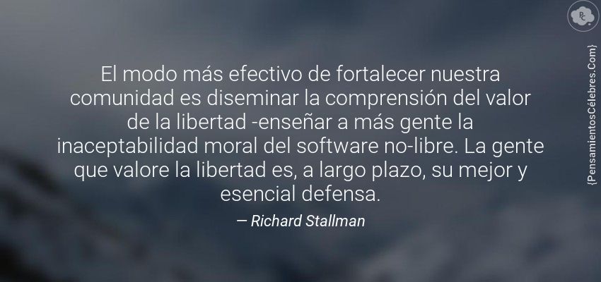 "El modo más efectivo de fortalecer nuestra comunidad es diseminar la comprensión del valor de la libertad -enseñar a más gente la inaceptabilidad moral del software no-libre. La gente que valore la libertad es, a largo plazo, su mejor y esencial defensa."