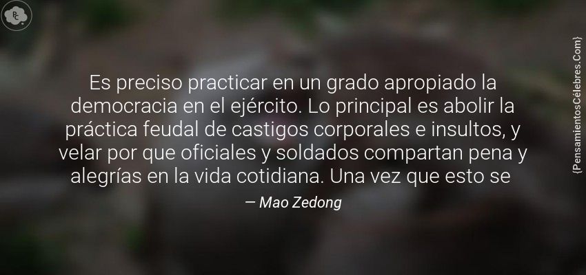 "Es preciso practicar en un grado apropiado la democracia en el ejército. Lo principal es abolir la práctica feudal de castigos corporales e insultos, y velar por que oficiales y soldados compartan pena y alegrías en la vida cotidiana. Una vez que esto se "