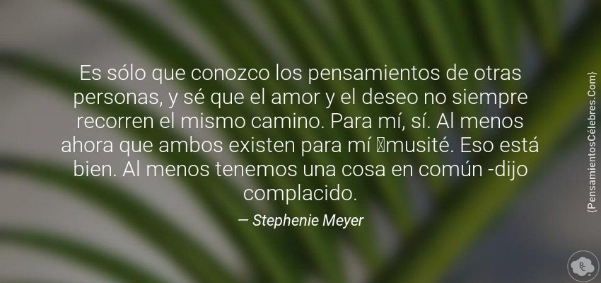 "Es sólo que conozco los pensamientos de otras personas, y sé que el amor y el deseo no siempre recorren el mismo camino. Para mí, sí. Al menos ahora que ambos existen para mí musité. Eso está bien. Al menos tenemos una cosa en común -dijo complacido."
