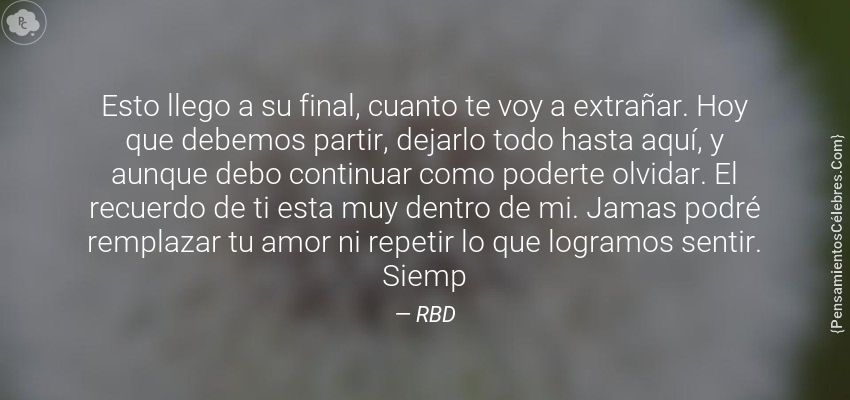 "Esto llego a su final, cuanto te voy a extrañar. Hoy que debemos partir, dejarlo todo hasta aquí, y aunque debo continuar como poderte olvidar. El recuerdo de ti esta muy dentro de mi. Jamas podré remplazar tu amor ni repetir lo que logramos sentir. Siemp"