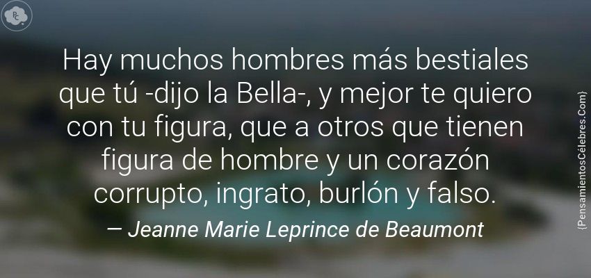 "Hay muchos hombres más bestiales que tú -dijo la Bella-, y mejor te quiero con tu figura, que a otros que tienen figura de hombre y un corazón corrupto, ingrato, burlón y falso."