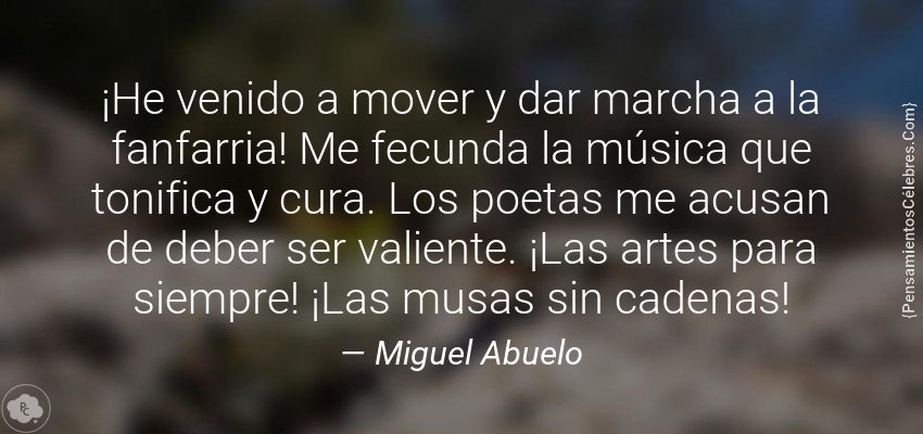 "¡He venido a mover y dar marcha a la fanfarria! Me fecunda la música que tonifica y cura. Los poetas me acusan de deber ser valiente. ¡Las artes para siempre! ¡Las musas sin cadenas!"
