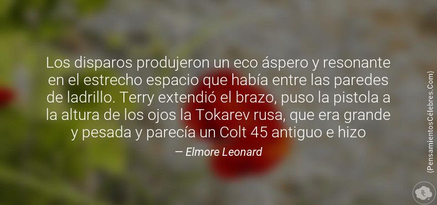 "Los disparos produjeron un eco áspero y resonante en el estrecho espacio que había entre las paredes de ladrillo. Terry extendió el brazo, puso la pistola a la altura de los ojos la Tokarev rusa, que era grande y pesada y parecía un Colt 45 antiguo e hizo"