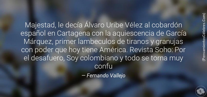 "Majestad, le decía Álvaro Uribe Vélez al cobardón español en Cartagena con la aquiescencia de García Márquez, primer lambeculos de tiranos y granujas con poder que hoy tiene América. Revista Soho: Por el desafuero, Soy colombiano y todo se torna muy confu"