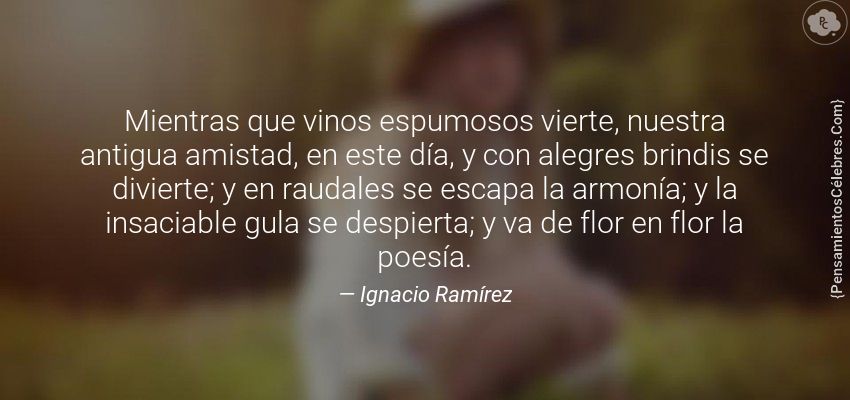 "Mientras que vinos espumosos vierte, nuestra antigua amistad, en este día, y con alegres brindis se divierte; y en raudales se escapa la armonía; y la insaciable gula se despierta; y va de flor en flor la poesía."