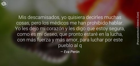 Mis descamisados, yo quisiera decirles muchas cosas, pero los médicos me han prohibido hablar. Yo les dejo mi corazón y les digo que estoy segura, como es mi deseo, que pronto estaré en la lucha, con más fuerza y más amor, para luchar por este pueblo al q