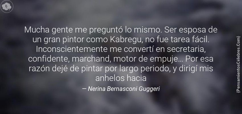 "Mucha gente me preguntó lo mismo. Ser esposa de un gran pintor como Kabregu, no fue tarea fácil. Inconscientemente me convertí en secretaria, confidente, marchand, motor de empuje… Por esa razón dejé de pintar por largo periodo, y dirigí mis anhelos hacia"