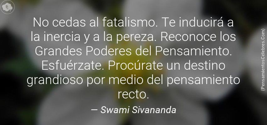 "No cedas al fatalismo. Te inducirá a la inercia y a la pereza. Reconoce los Grandes Poderes del Pensamiento. Esfuérzate. Procúrate un destino grandioso por medio del pensamiento recto."