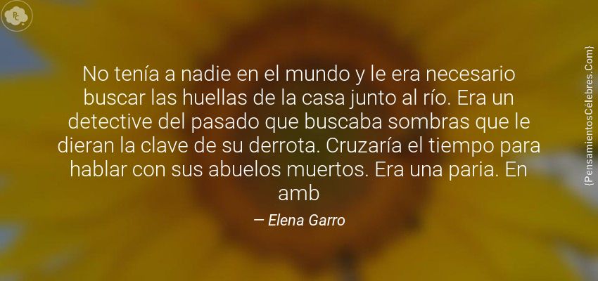 "No tenía a nadie en el mundo y le era necesario buscar las huellas de la casa junto al río. Era un detective del pasado que buscaba sombras que le dieran la clave de su derrota. Cruzaría el tiempo para hablar con sus abuelos muertos. Era una paria. En amb"