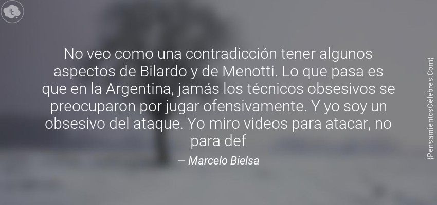 "No veo como una contradicción tener algunos aspectos de Bilardo y de Menotti. Lo que pasa es que en la Argentina, jamás los técnicos obsesivos se preocuparon por jugar ofensivamente. Y yo soy un obsesivo del ataque. Yo miro videos para atacar, no para def"