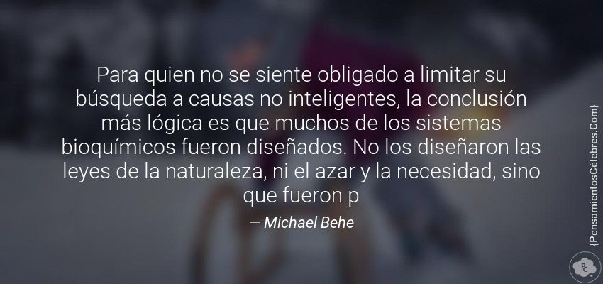 "Para quien no se siente obligado a limitar su búsqueda a causas no inteligentes, la conclusión más lógica es que muchos de los sistemas bioquímicos fueron diseñados. No los diseñaron las leyes de la naturaleza, ni el azar y la necesidad, sino que fueron p"