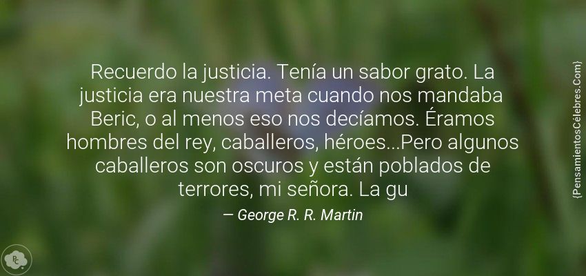 "Recuerdo la justicia. Tenía un sabor grato. La justicia era nuestra meta cuando nos mandaba Beric, o al menos eso nos decíamos. Éramos hombres del rey, caballeros, héroes...Pero algunos caballeros son oscuros y están poblados de terrores, mi señora. La gu"