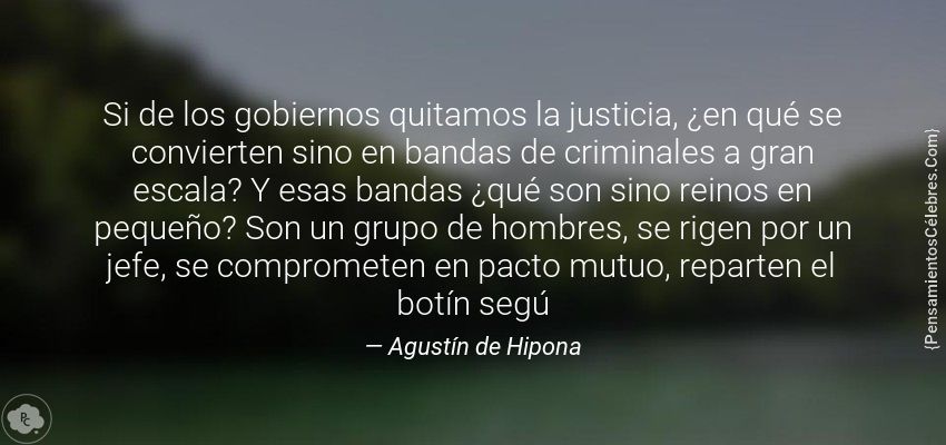 "Si de los gobiernos quitamos la justicia, ¿en qué se convierten sino en bandas de criminales a gran escala? Y esas bandas ¿qué son sino reinos en pequeño? Son un grupo de hombres, se rigen por un jefe, se comprometen en pacto mutuo, reparten el botín segú"