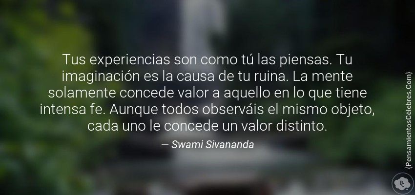 "Tus experiencias son como tú las piensas. Tu imaginación es la causa de tu ruina. La mente solamente concede valor a aquello en lo que tiene intensa fe. Aunque todos observáis el mismo objeto, cada uno le concede un valor distinto."